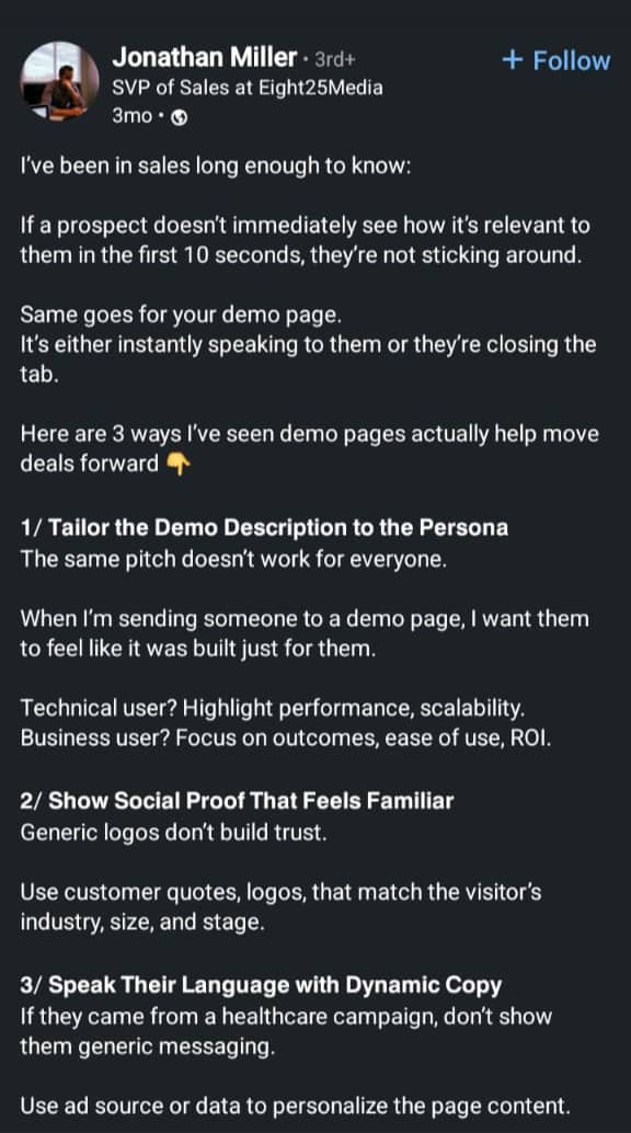Before you even show your demo, remind them why they're on this call. "You mentioned you're losing 10 hours every week on manual data entry. Let me show you how this solves that specifically for you."
